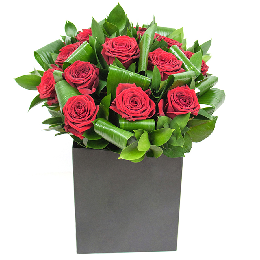 Experience Pure Elegance with our exquisite bouquet featuring radiant red roses, lush aspidistra leaves, and graceful ruscus. Each bloom is hand-selected to ensure exceptional freshness and quality, resulting in a unique and luxurious arrangement.